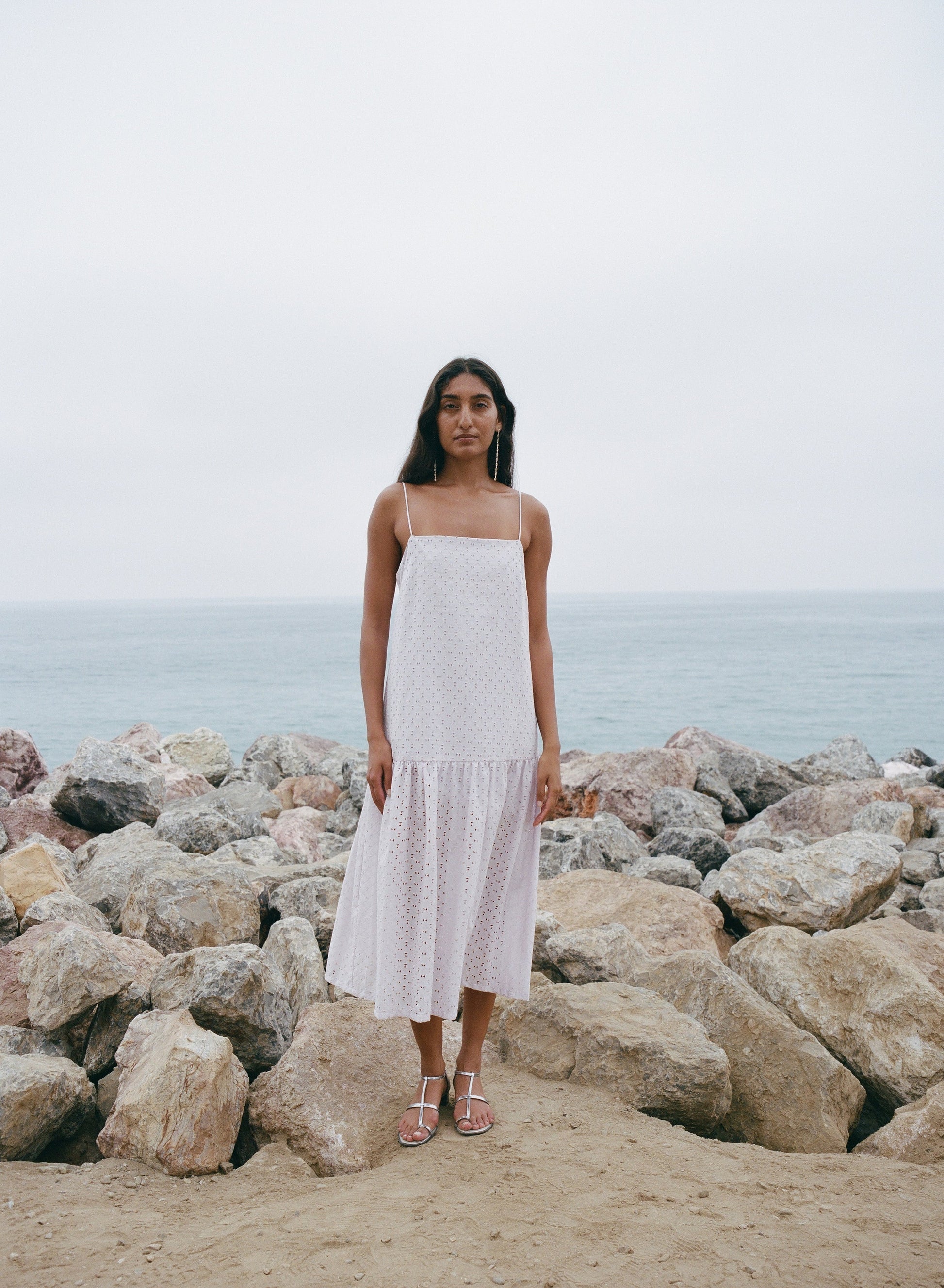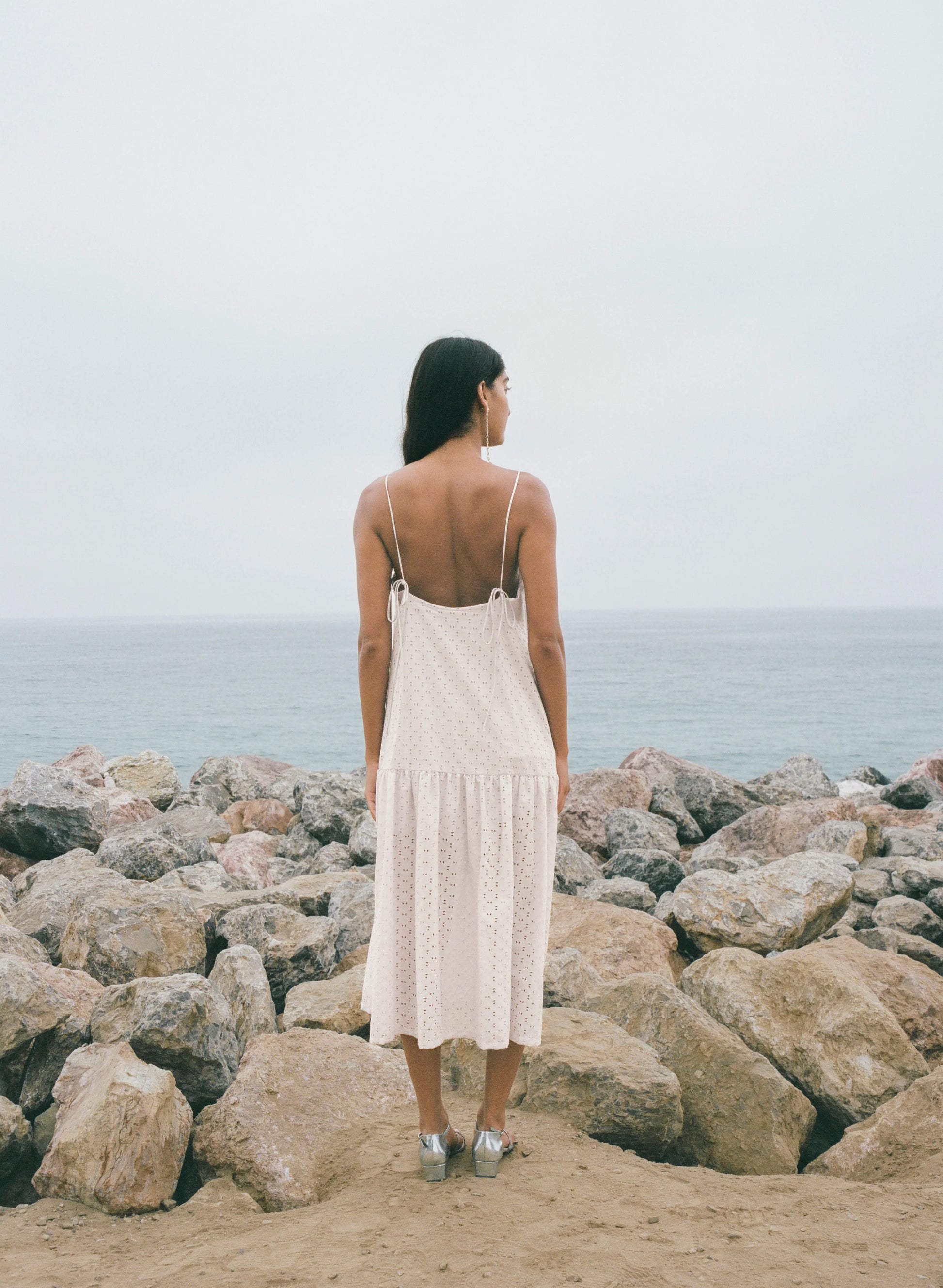 Easy fit drop waist dress in open-work geometric cotton eyelet. Fine straps tie at base of back.