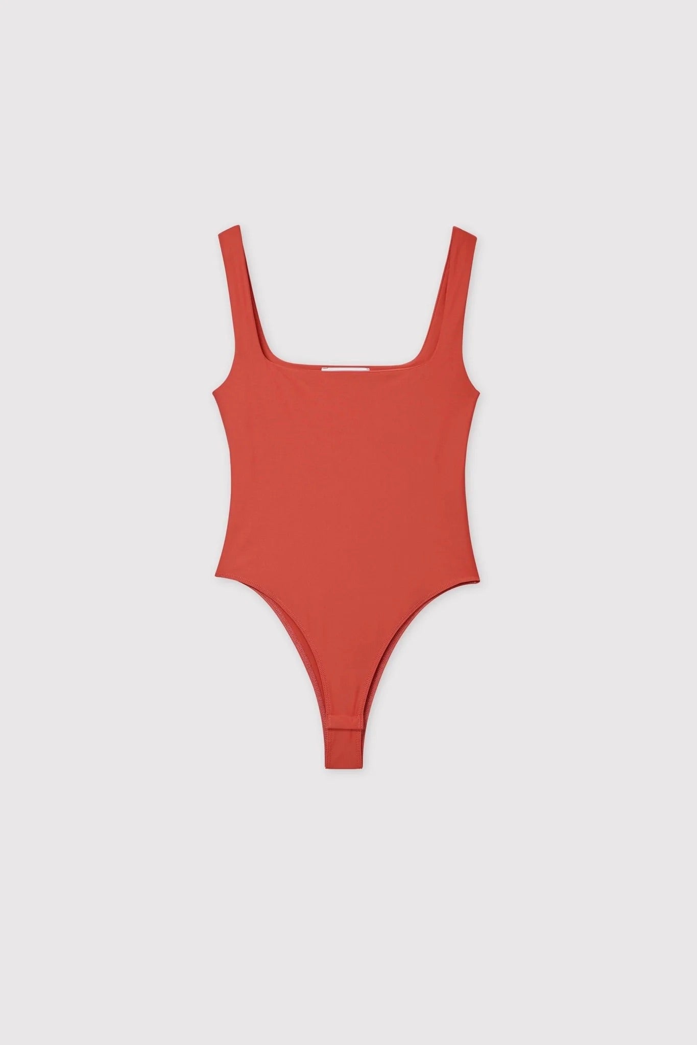 Slim silhouette with a square neckline. Matching snap button closure. Supportive lining.