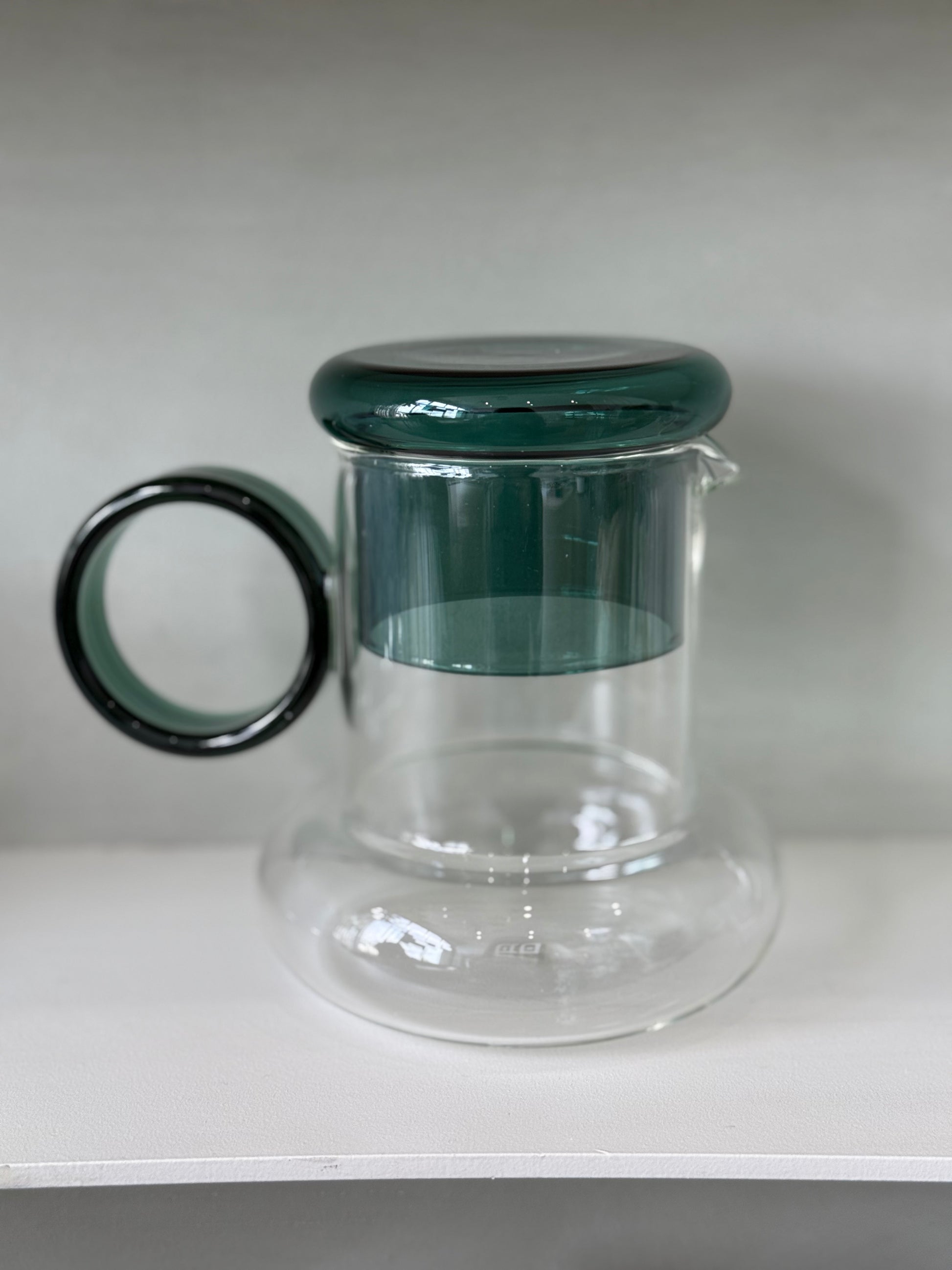 This adorable carafe with fun green handle. The green lid acts as a cute cup and will look really nice next to your bed. Hold about two glasses of water.