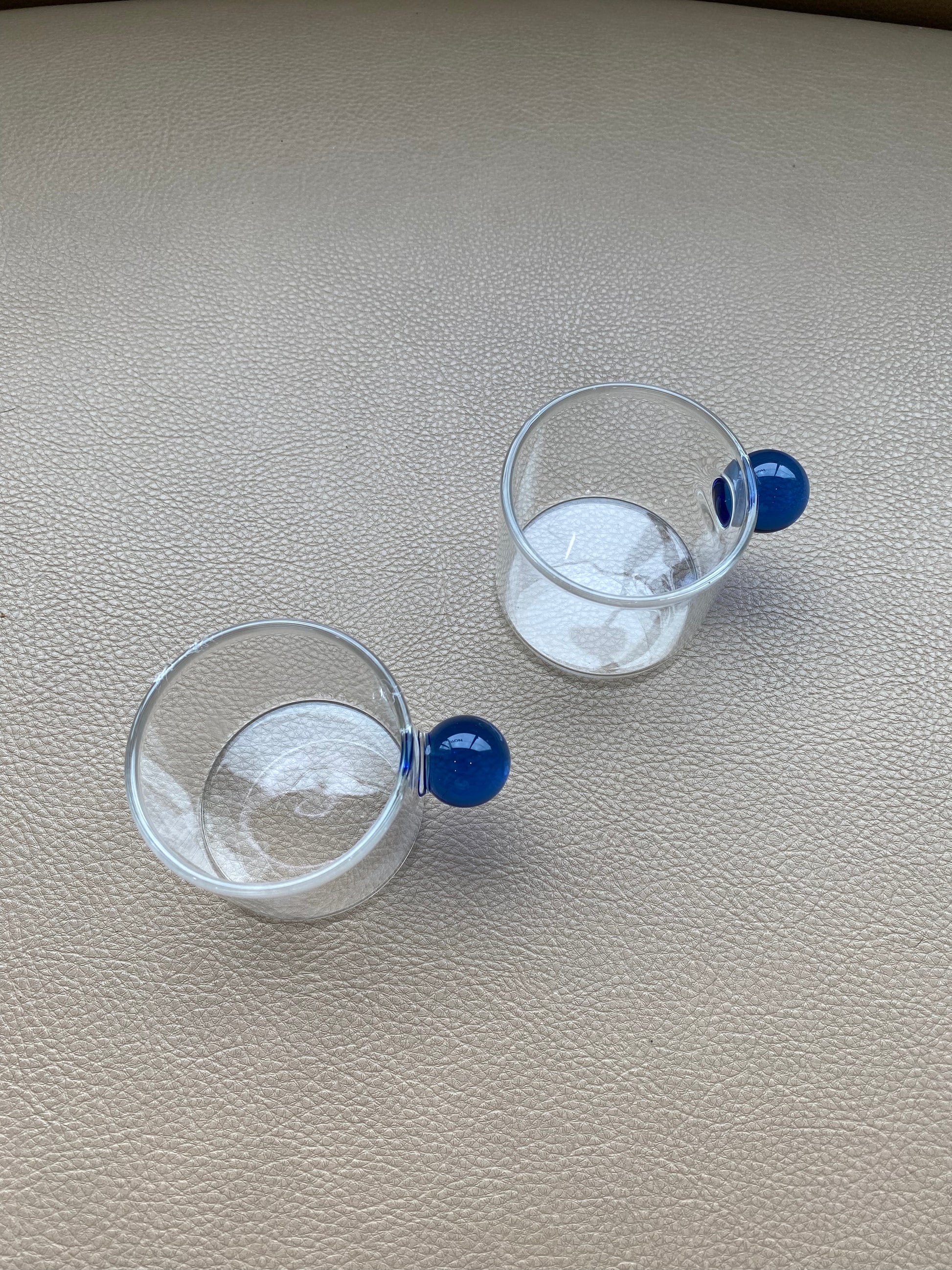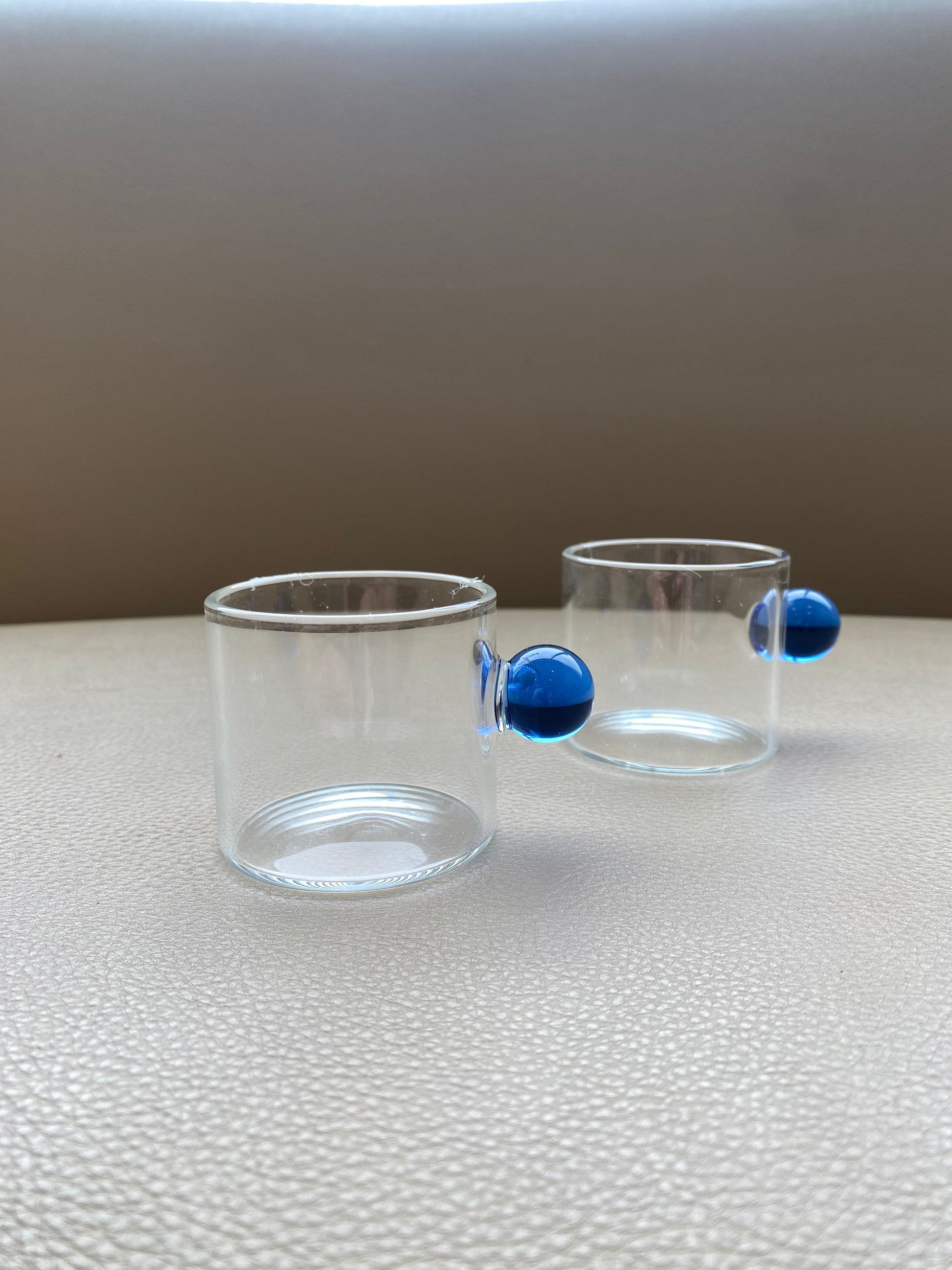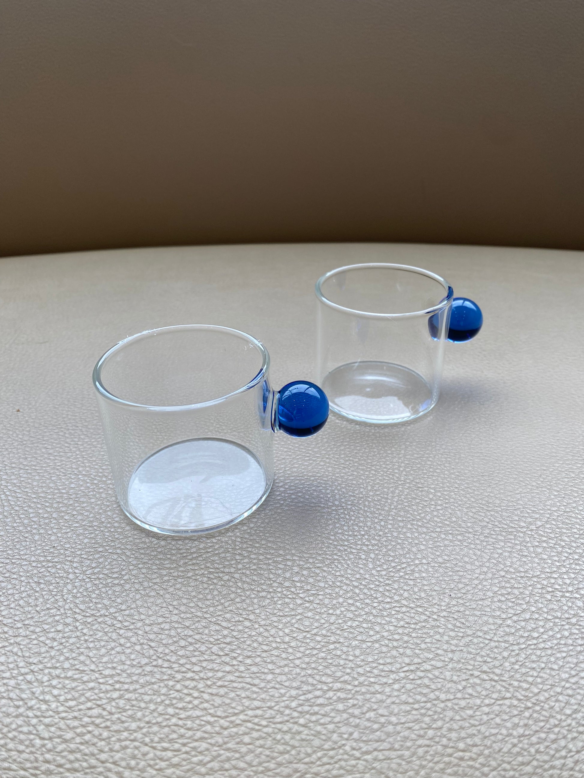 Set of 2 glass espresso cups with either green, amber, or blue knob handles