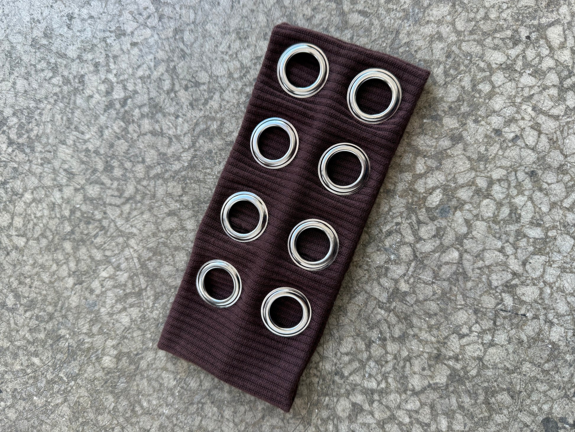 This super cool, thick stretchy headband has metal eyelets to add a bit of a unique edge to your boring hairstyle. Comes in brown