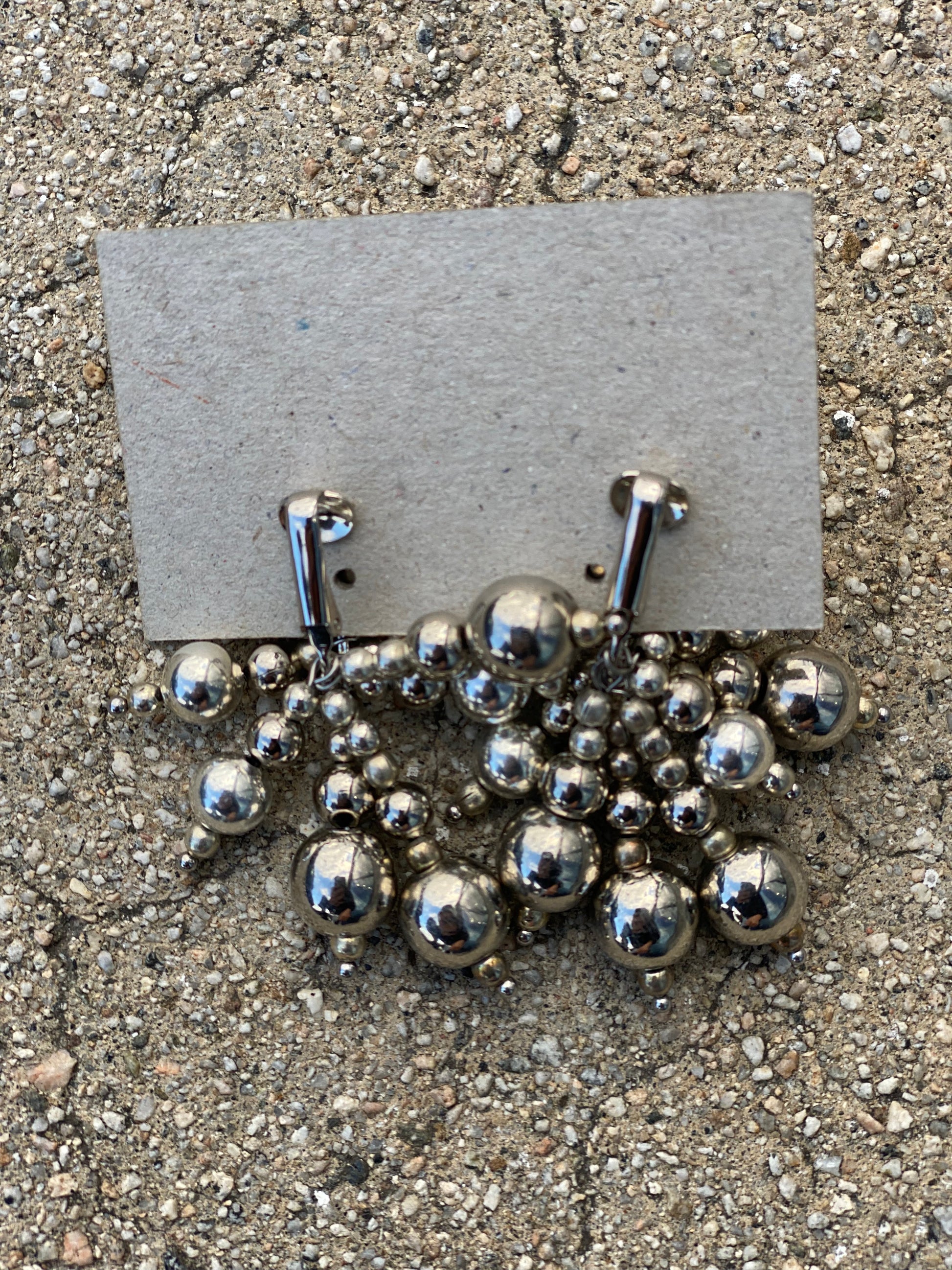 The Bouquet Earrings, consist of two different vintage flower cabochons with a mix of rhodium beads on stainless steel clip-ons. The earring length is 2 inches and flower cabochons are 16mm wide.