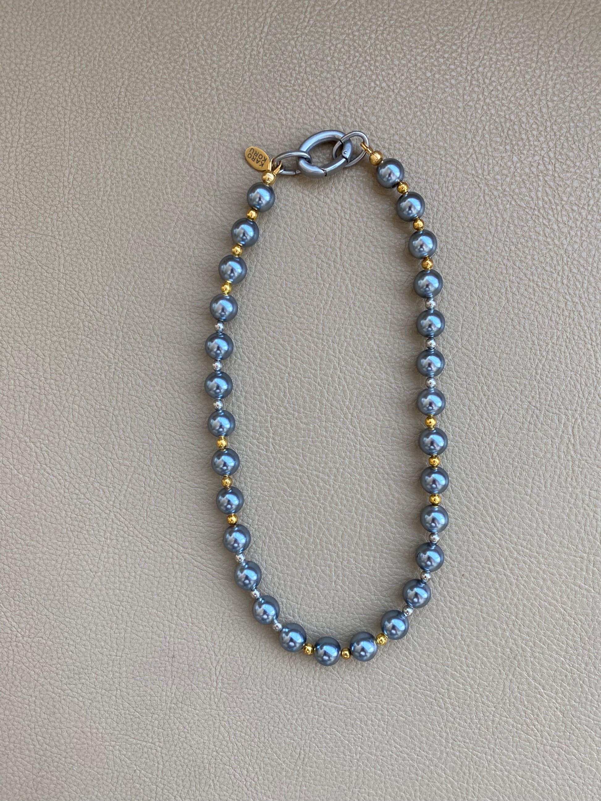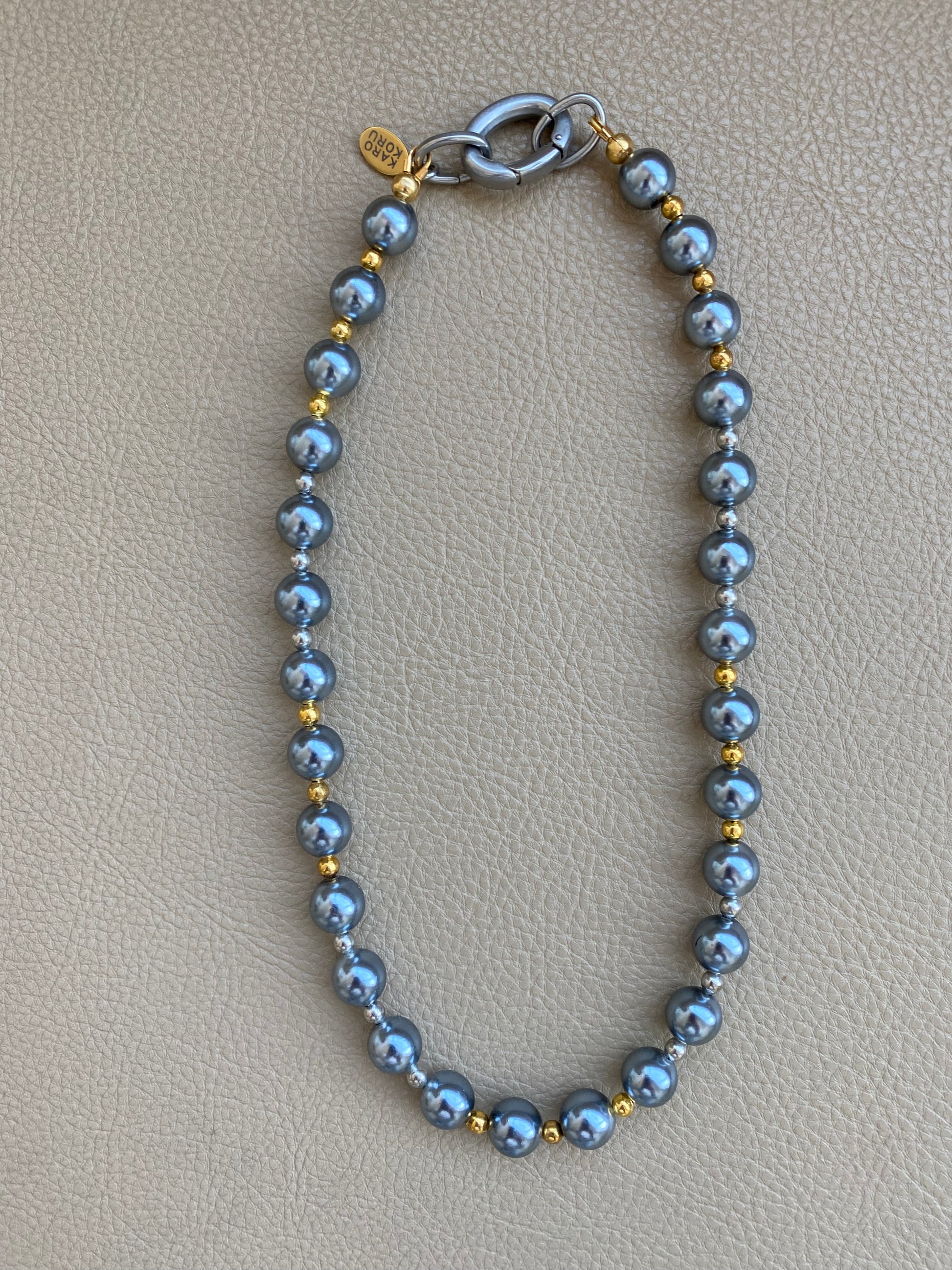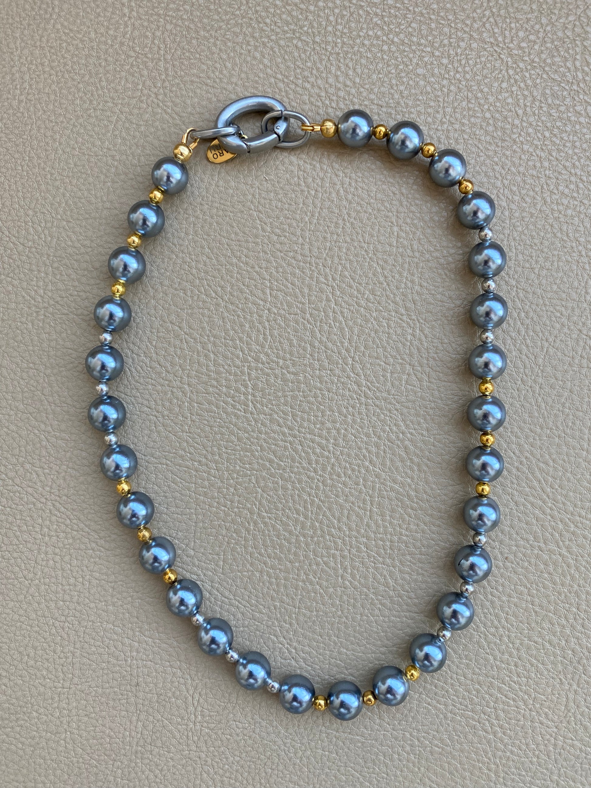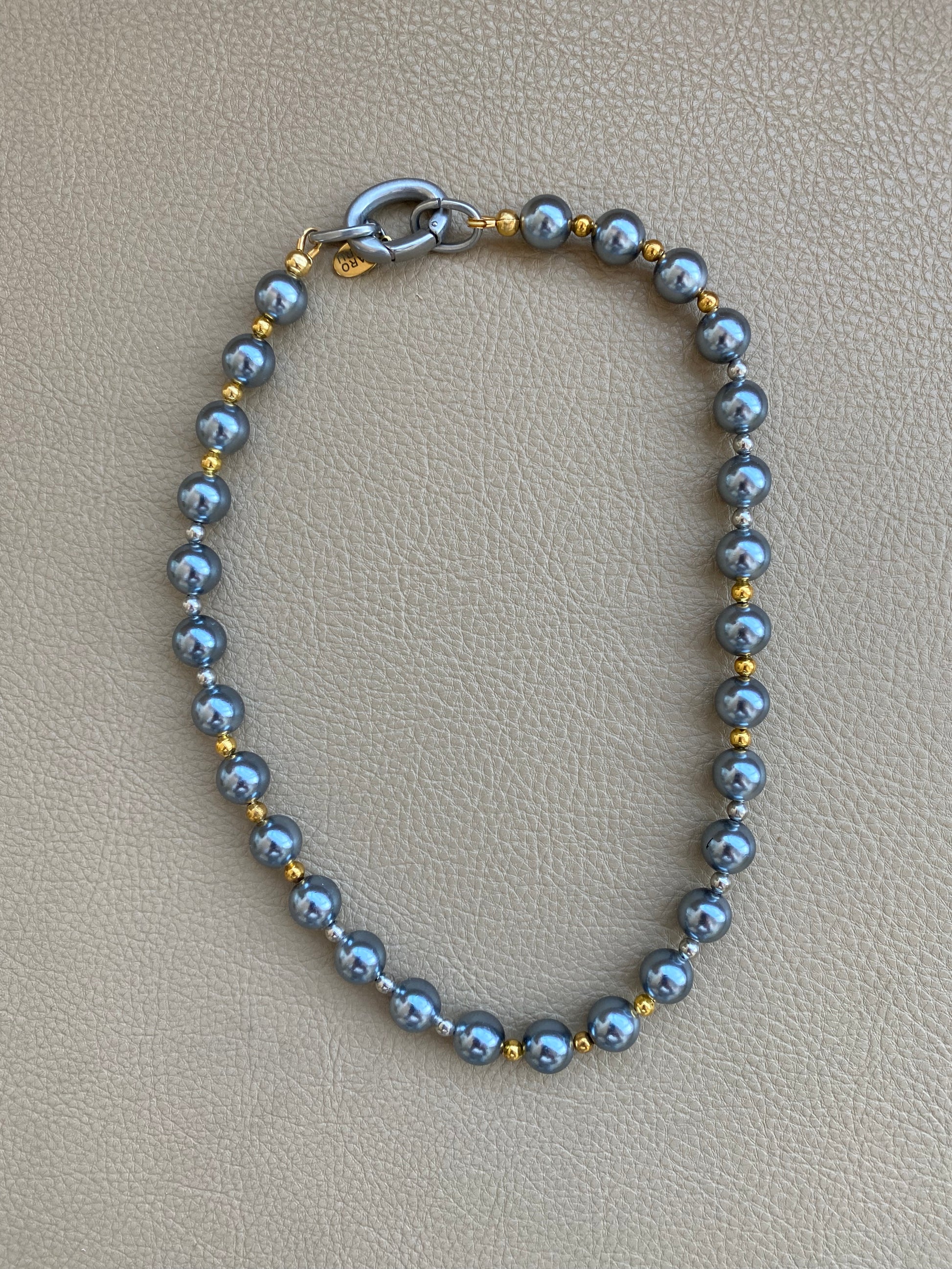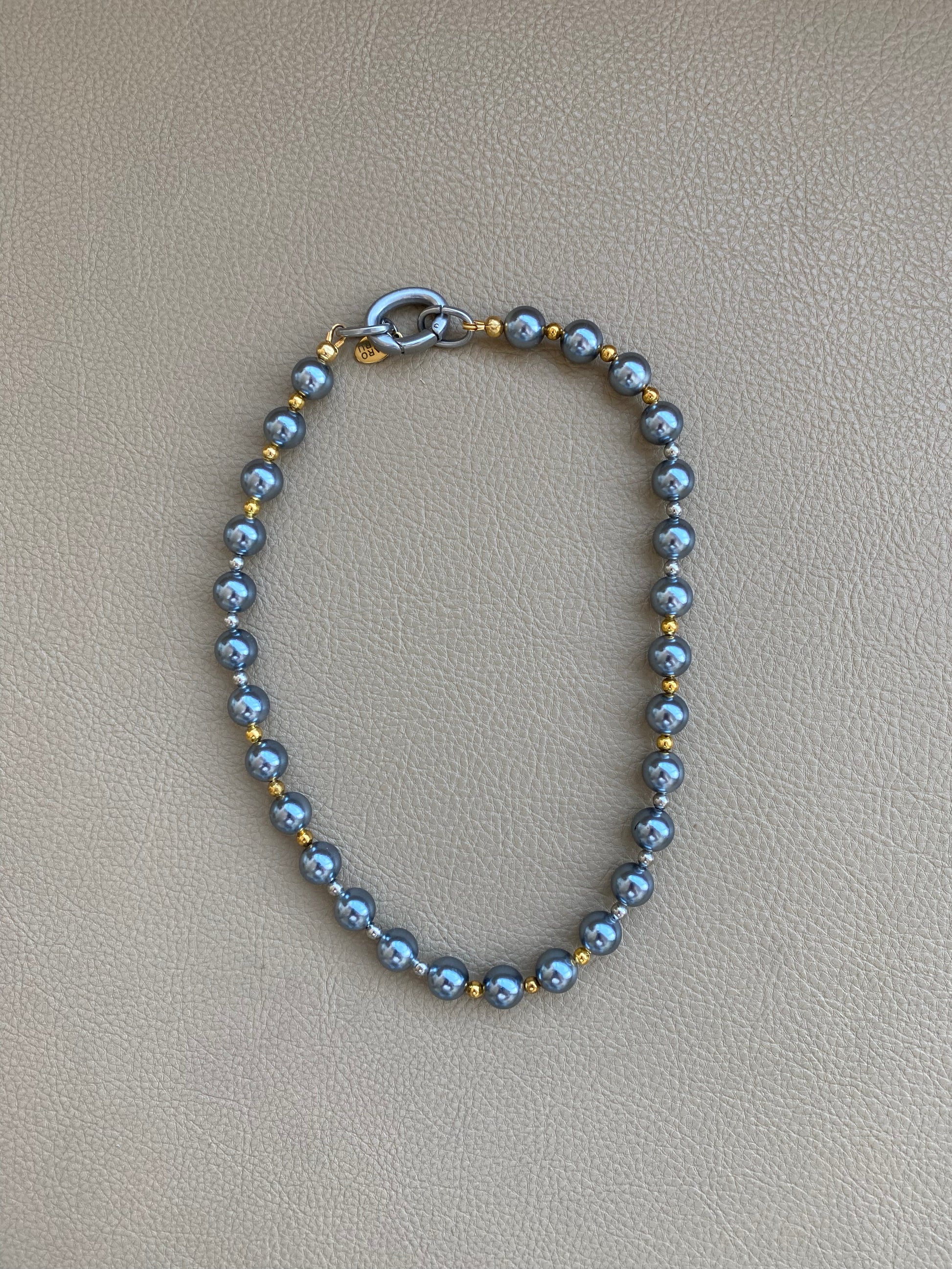 This Pearl Necklace has Vintage silver glass pearls (10mm) with stainless steel and gold-plated mini beads with stainless steel clasp.
