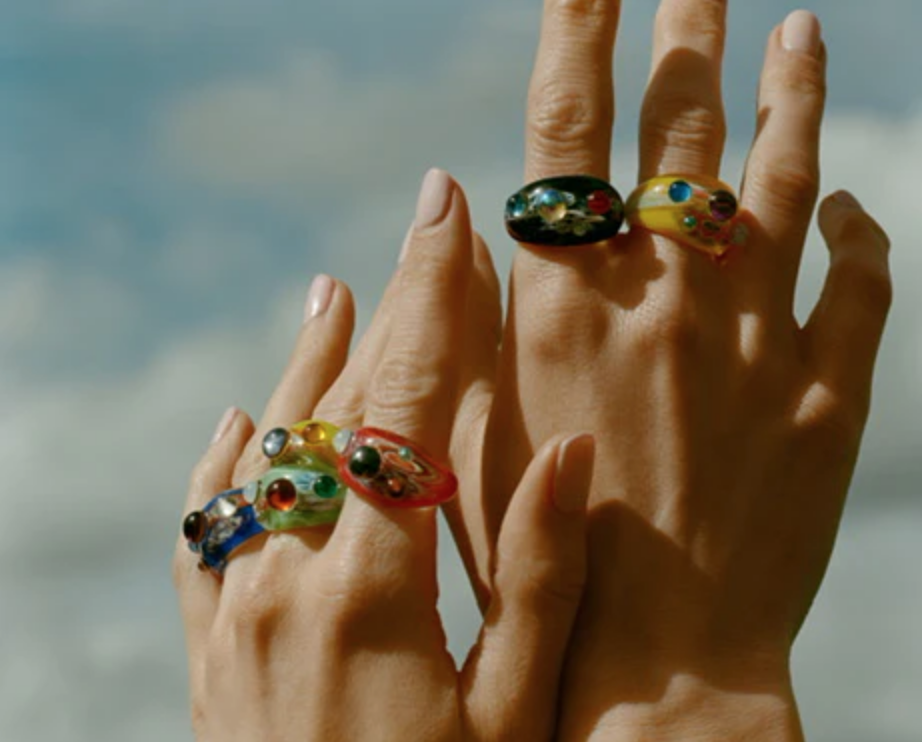 Karo Koru joyfully launches our first ever line of rings as a part of our Midnight Sun Collection! We discovered a treasure trove of Vintage Murano Style Glass Lamp Work Rings and artfully paired them with vintage glass gabochons to make a bold statement piece for any occasion. Wear one (we suggest several) to complete any look and drum up compliments wherever your day takes you.
