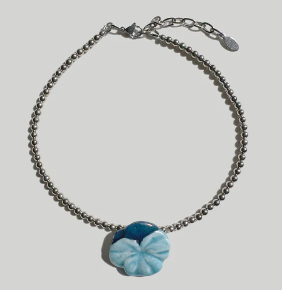 Punk meets pretty as vintage metallic rhodium beads (4mm) are paired with vintage ceramic flower pendant (28 x 31mm) and stainless steel lobster clasp. The choker is 13 inches with 2 inch extension chain.