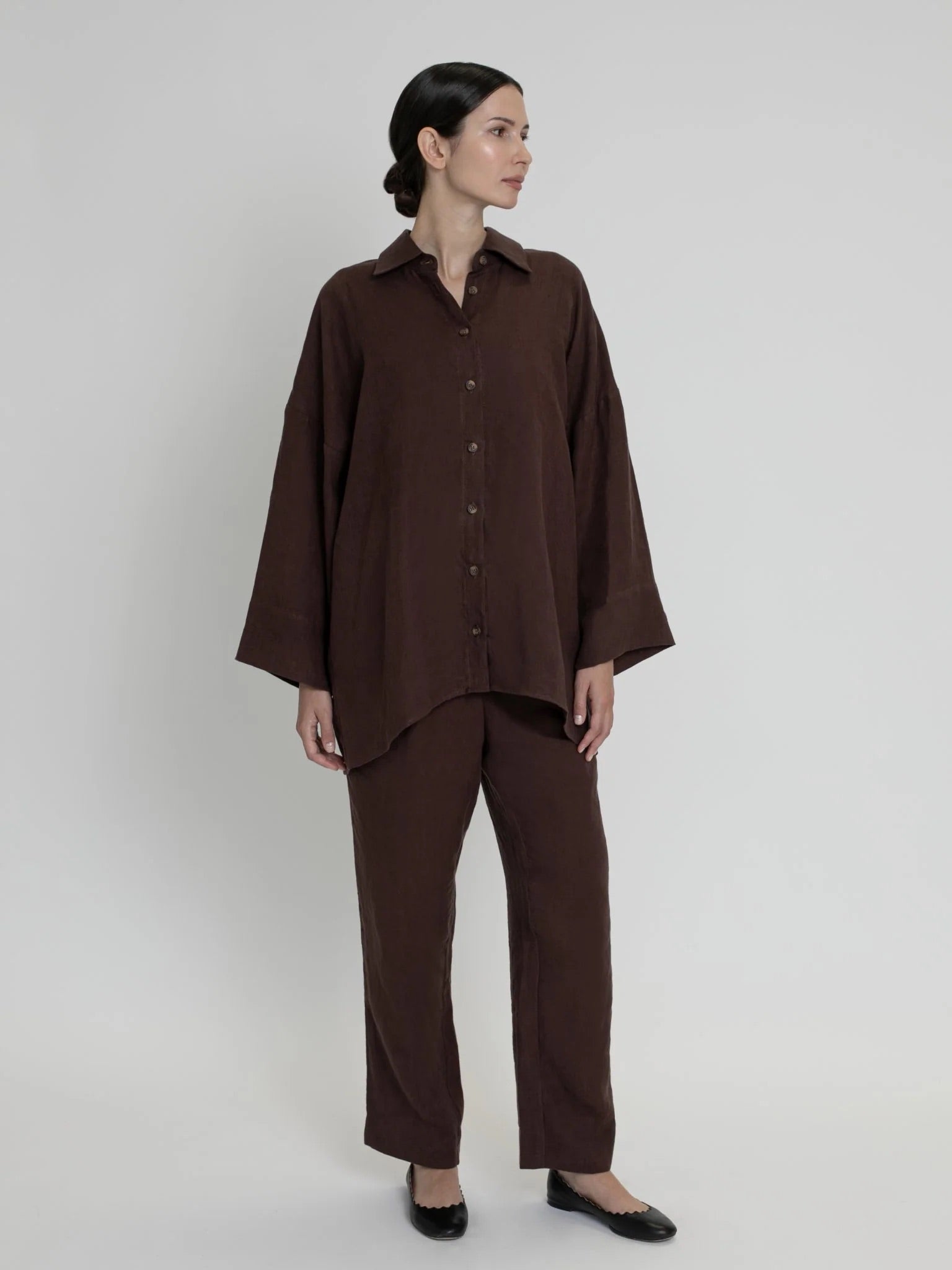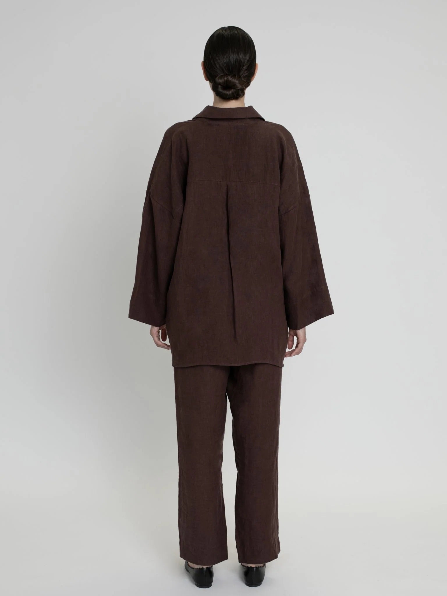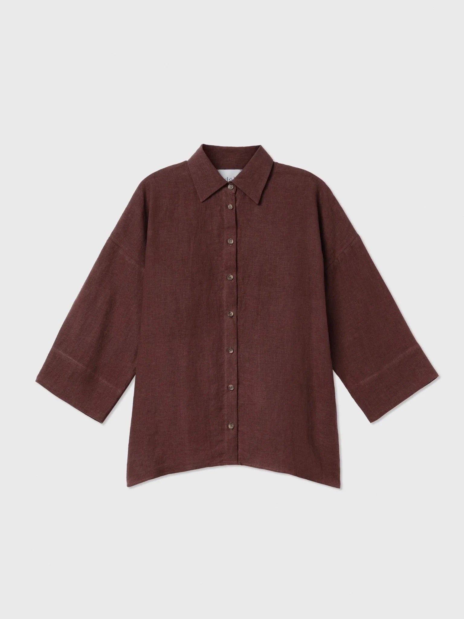 Confidently realized with a pointed collar and dropped shoulders, the Linen Button Down Shirt is finished with shell buttons and extra-wide sleeves plus an inverted pleat detail at the back body.