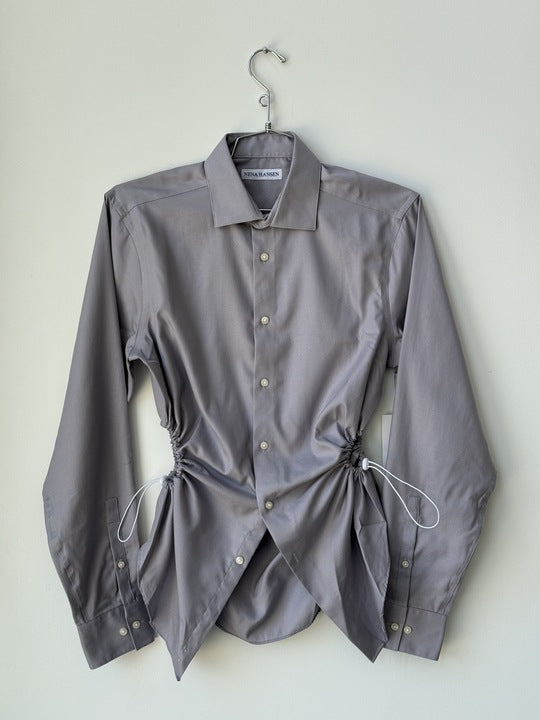 A classic reimagined. This one-of-a-kind vintage men's dress shirt is a modern update with side cut outs and an adjustable bungee cord that cinches the waist for a customizable fit. Crafted in Vancouver, Canada from vintage cotton or cotton-blend shirting, each piece is sustainably upcycled — honoring the shirt's original structure while redefining it with a fresh silhouette.
