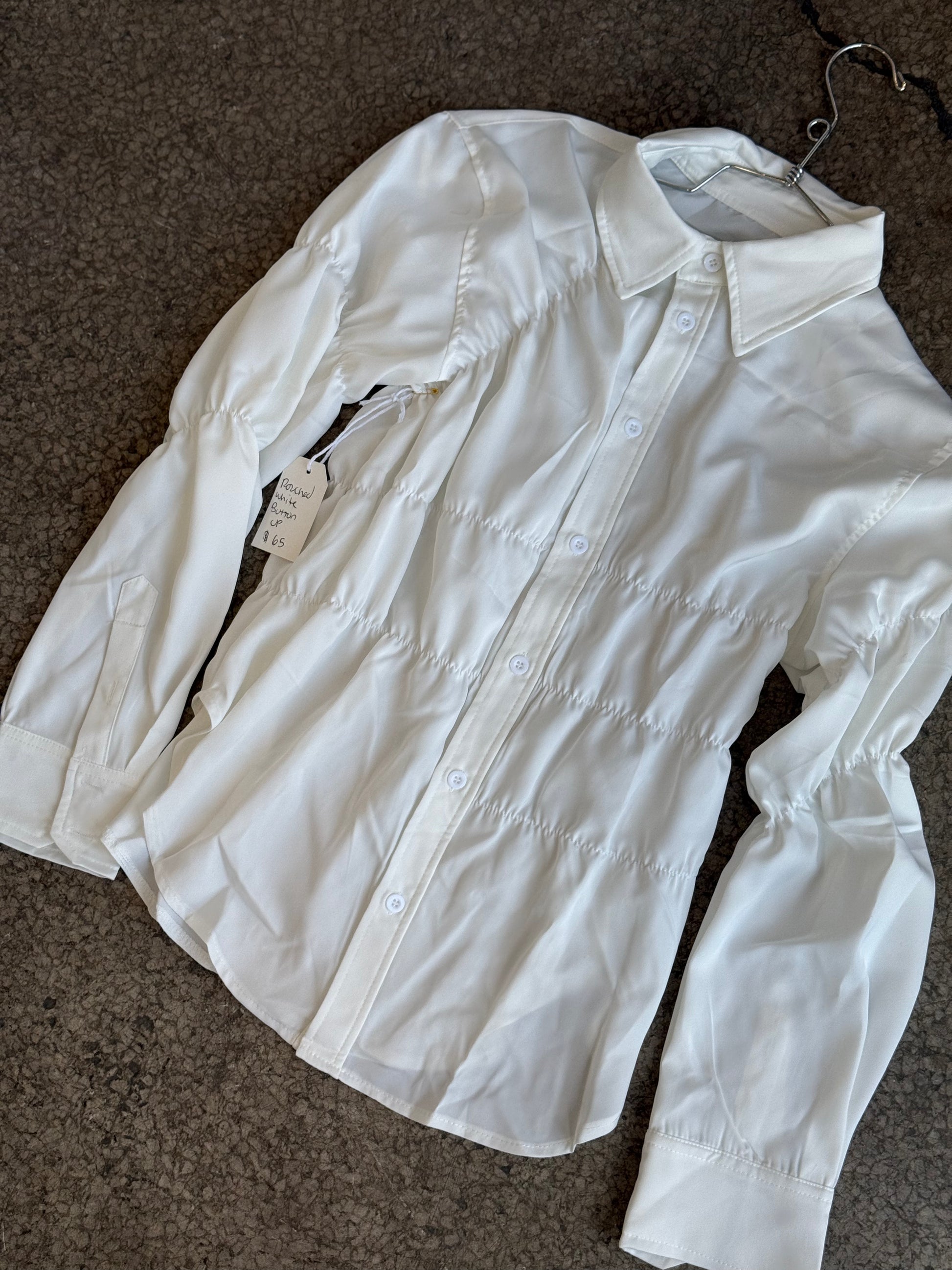 White Sateen finished slightly scrunched button down shirt. Looks great dressed up or way down. Size Small