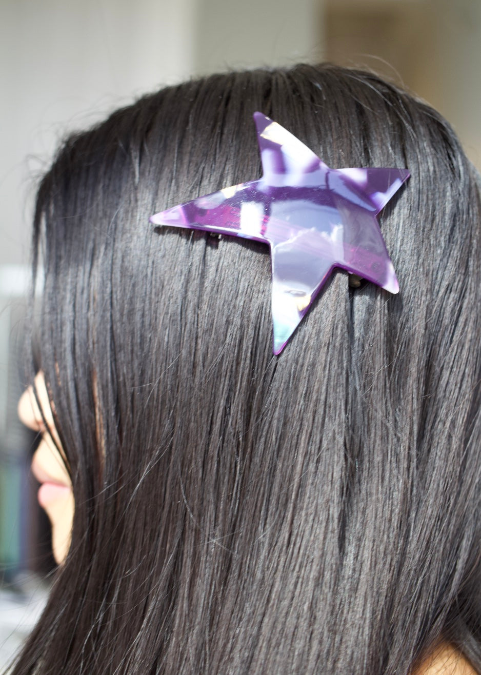 100% Acetate with Metal Clip in a purple swirl design