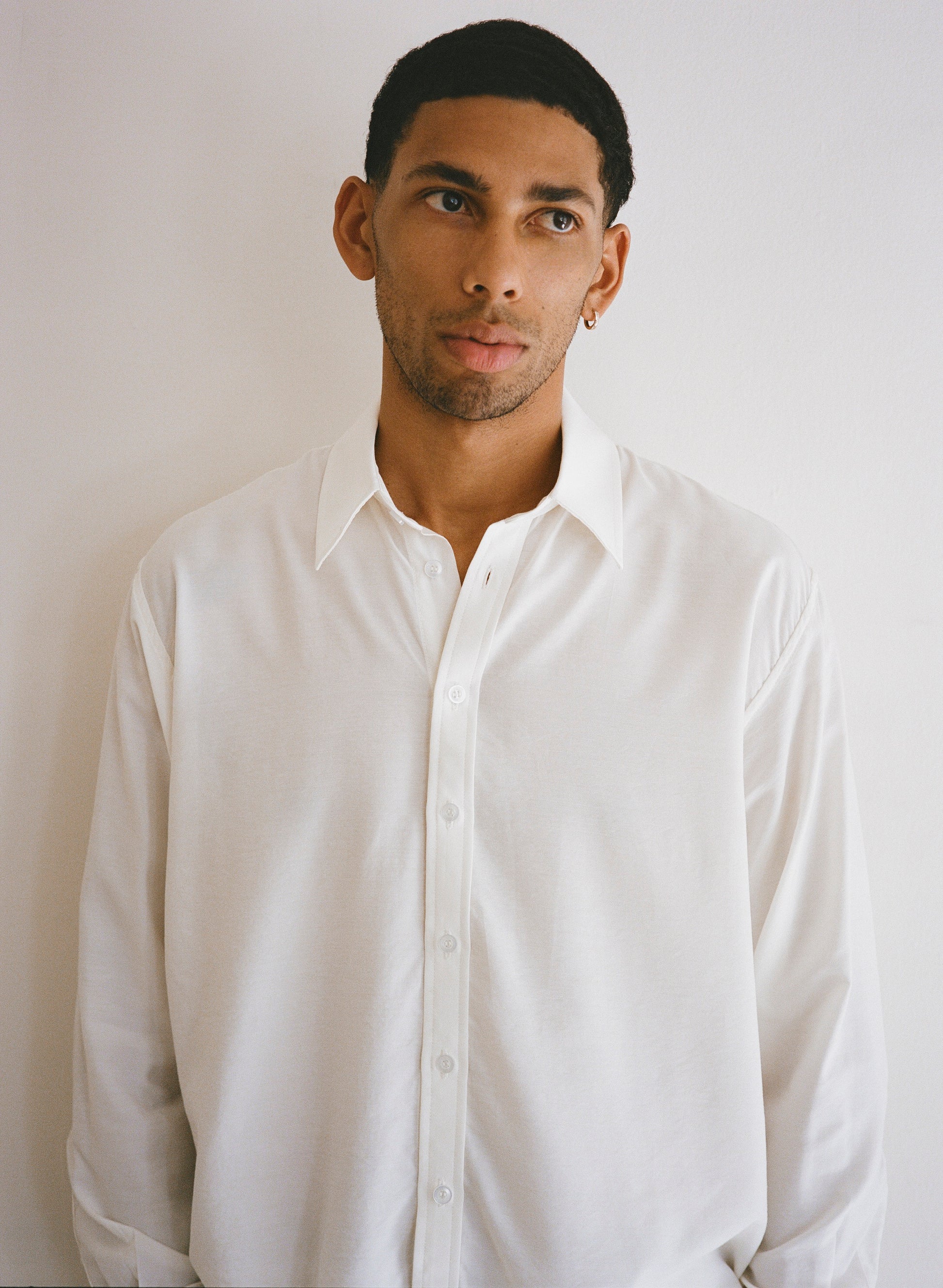 A unisex button down shirt with a loose boxy fit and classic details with french seams. Features a straight point collar & a third sleeve placket button.