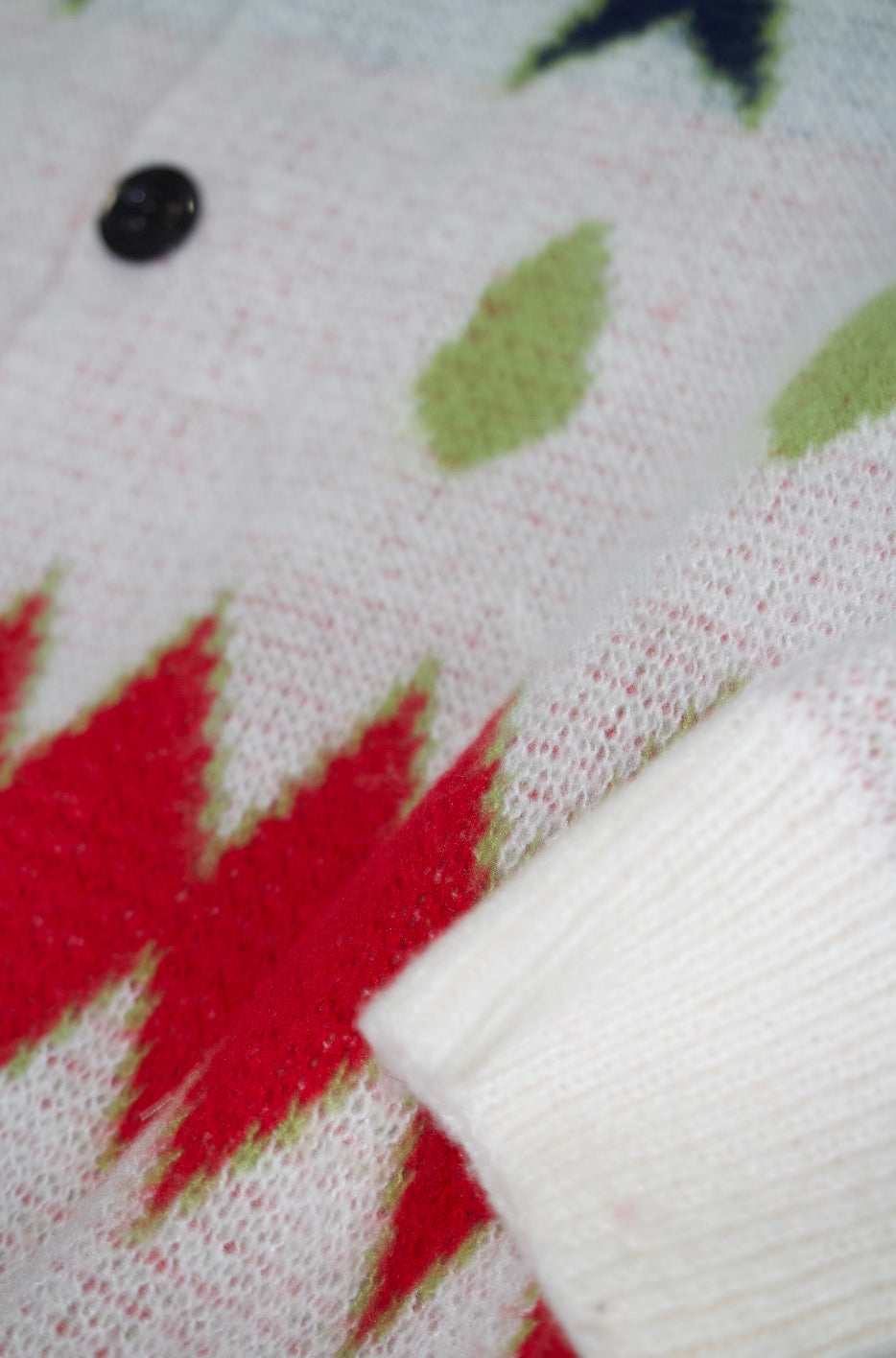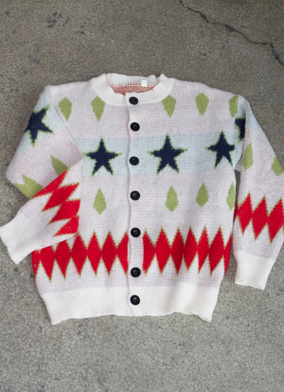 Oversized wool blend vintage deadstock cardigan sweater with cream, red, blue, and green design.