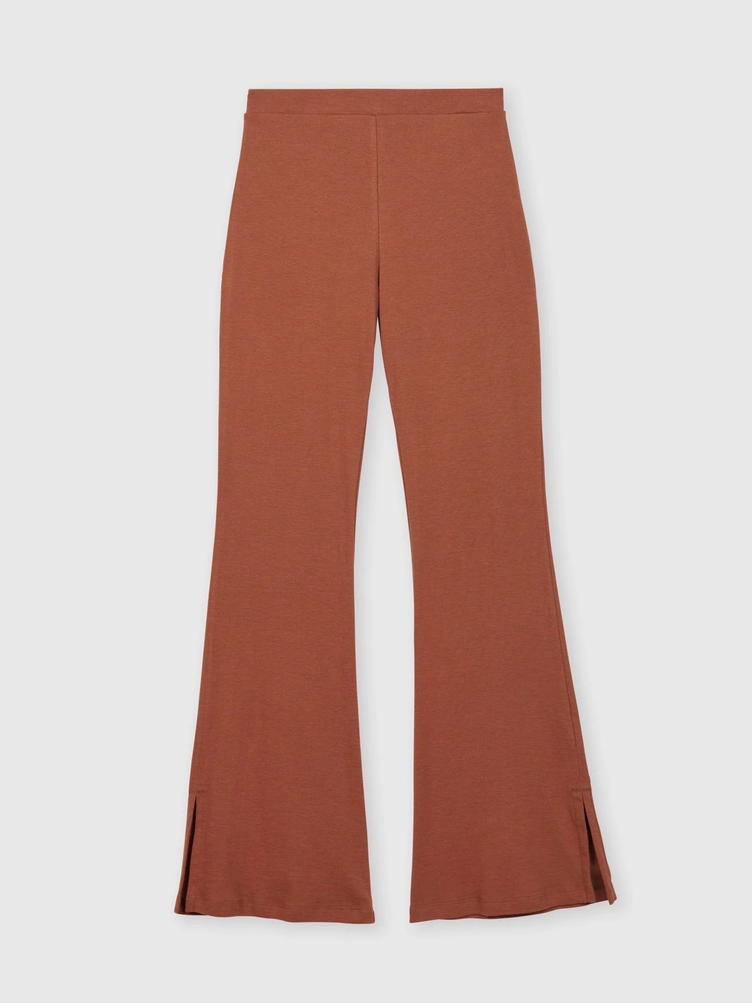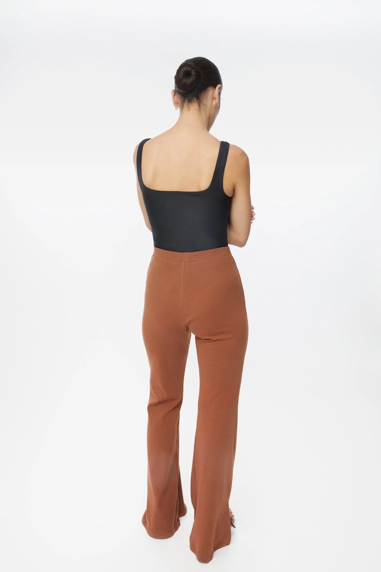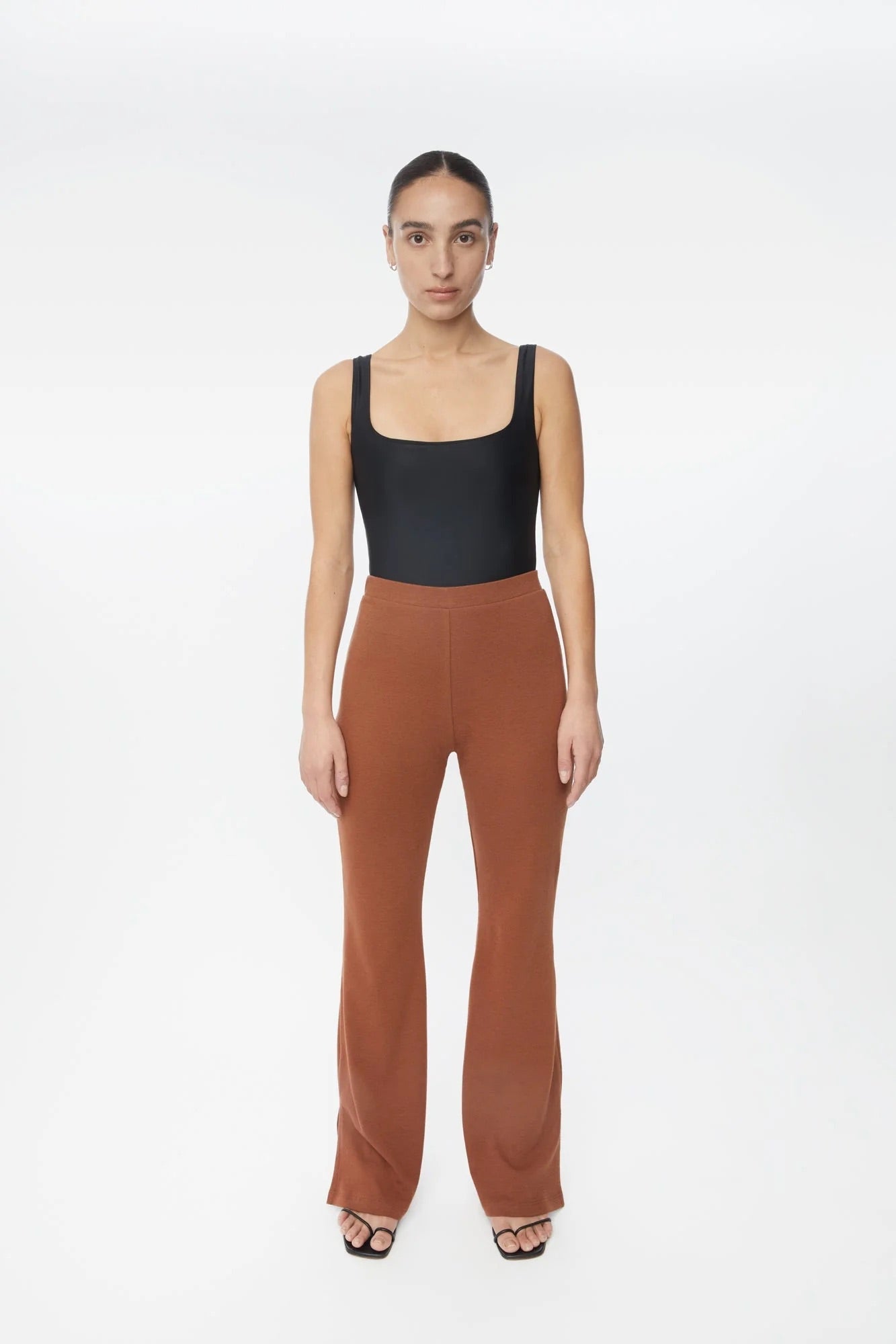 - Pull-on style - high rise elastic waist, our knit flare pants effortlessly slip on for comfort that molds to the body.